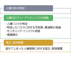 企業としての人権対応は、現在下記の流れで進めることが推奨されています。石光商事グループでは人権方針の策定が済んでおり、ウェブサイト上でも開示を行っています。現在人権DDパートに取り掛かっており、人権リスクの特定に向け、サプライヤーへの質問票の作成を行っています。
